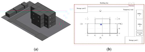 BIM model and site layout (a) BIM model of the building with precast components. (b) Roads and temporary facilities in the construction site layout.