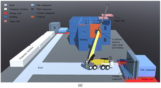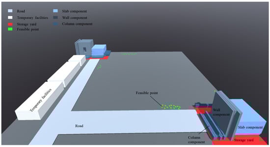 The environmental constraint check, operation constraint check, and safety constraint check were performed orderly using the positioning module to check the feasibility of the selected crane type. The points satisfying the three constraints were set as the feasible location points, which meant these components could be hoisted safely. However, it was found that in terms of the initial crane type QY90K, all constraints with the lifting components could not be satisfied. Thus, the crane type had to be eliminated from the alternatives. Figure 7 shows the scenarios in which crane QY90K was inconsistent with the three constraints. Specifically, Figure 7a shows the crane was located within the boundaries of the existing buildings, which is defined by the minimum clearance, Figure 7b shows the weight of the lifting component that exceeded the rated lifting capacity, and Figure 7c shows there was a collision between the crane boom and the building during lifting operation. Another alternative crane type QY100K-I with the minimum cost was loaded as a new initial type for repeated constraint testing. As a result, this crane type conformed with all of the constraints, and the feasible location points were obtained (see Figure 8).