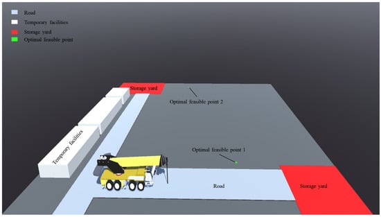Based on the obtained feasible points for all lifting components, the combination with the minimum relocations of 2 (i.e., the optimal location point 1 and 2 in Figure 9) and the shortest lifting time was determined using the optimization module. The optimal locations were highlighted in the construction site layout. As shown in Figure 9, the highlighted combination of feasible points represents the optimal locations for the selected mobile crane QY100K-I.