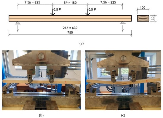 The arrangement and loading of the test specimens and experiments were designed to correspond to the actual state of the connection in a real load-bearing structure. Timber with strength grade GL24h was used for the experiments. These mechanical properties were confirmed by a four-point flexural strength test (Figure 2). A total of 18 planks were cut from the damaged experiments of structures (frame connection) after testing. The nominal dimensions of the specimen were as follows: length, 750 mm; width, 100 mm; height, 30 mm. The specimen was placed on a support with a span of 630 mm and a distance of the applied force from the support on both sides of 225 mm. The loading was performed with a force value of 1.50 kN/min. Table 1 shows the results of the four-point flexural strength test.