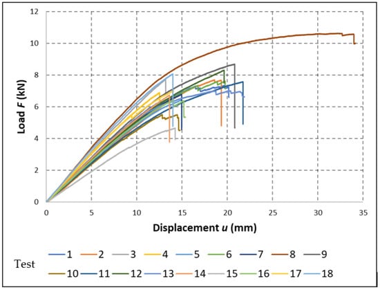 Load–displacement diagrams of individual specimens of the four-point flexural test.