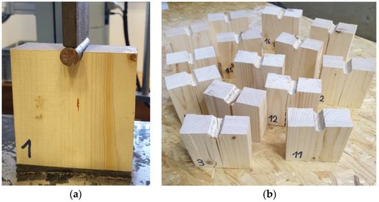 Another laboratory test of timber properties involved the determination of embedment strength and compressibility characteristics for dowel fasteners (Figure 4). This test also confirmed the strength class of the timber. A total of 14 such tests were performed. The nominal size of the specimen was 80 mm wide, 80 mm high, and 40 mm thick. A 16 mm diameter hole was drilled in the specimens and loaded with a 14 mm diameter dowel. The load was chosen to be deformed with a set value of 1 mm/min. The test procedure was performed according to EN 383 [].