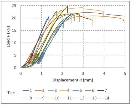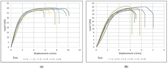 A total of six specimens were tested for each type of fastener. The load–deformation diagrams of the individual tests are shown in Figure 7.
