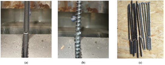 Two types of fasteners were used to make the connection. The first type was a threaded rod. The outer diameter of the threaded rod was 8 mm, and the core diameter was 7.25 mm. The length of the threaded rod 360 mm served as a bolt, and the length of 300 mm served as a dowel in the connection. The second type was a full-threaded screw. The outer diameter of the screw was 8 mm, and the diameter of the screw core was 5 mm. The length of the screws was 300 mm. The mechanical properties of the fasteners were also verified by laboratory tensile strength test (Figure 6). The results obtained by the tear tests are shown in Table 3.