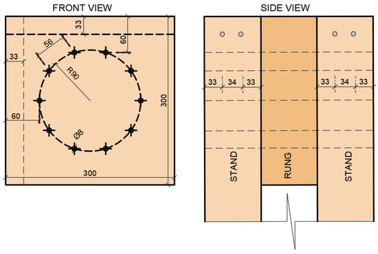 The timber structure system of the experiment was created from a semirigid connection of two frame struts and a crossbar. In total, two identical construction systems were created, the only difference being the fastener used. Experiment A contained a combination of bolts and dowels as fasteners, and the second experiment (B) involved full-threaded screws. The strut segment had a cross-section of 100/300 mm, and the cross-member segment had a cross-section of 100/300 mm. The arrangement of fasteners in both experiments was identical. They were located on one symmetrical circle with a radius r = 90 mm with a number of 10 pieces. The arrangement of the connecting means is shown in Figure 8. The selected geometry met the basic conditions of the distance from the edges and between the connecting means given by Koželouh (2004) []. The figure below also shows the reinforcement of the individual segments. The reinforcement was made using two full-threaded screws inserted next to each other on one segment of the structure with a diameter of 8 mm and a length of 300 mm. The deployment was performed on the basis of analytical assumptions of the action of the highest tensile stresses perpendicular to the fibers.
