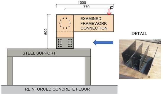 In order to perform these experiments, it was necessary to create the boundary conditions of the structure. To ensure the correct boundary conditions, a steel structure was designed, calculated, and made into a steel plate of the desired shape, which was fastened by means of bolts and into which semirigid connection struts were subsequently fastened by means of 24 bolts with a diameter of 8 mm. This connection was precalculated and designed to be four times the estimated force that would cause the connection to collapse. The entire steel structure was placed on a reinforced concrete floor and centered at the required distance from the press head so that the press would push exactly to the desired location on the front. A schematic representation of the experiment is shown in Figure 9.