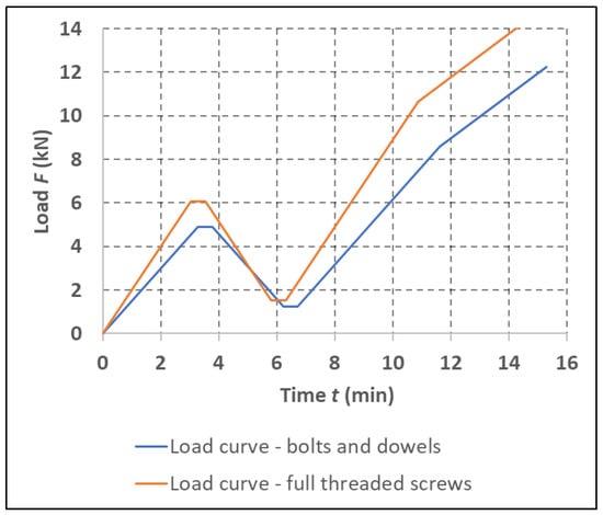 The loading of the test specimens was static according to Figure 10 until the specimens failed. During testing, there was continuous a recording of time, force, deformation, and displacement of the press head. The loading process was performed in accordance with standard EN 26891 [], which specifies the loading procedure for the experimental testing of connections of timber structures. This standard specifies the following loading procedure: