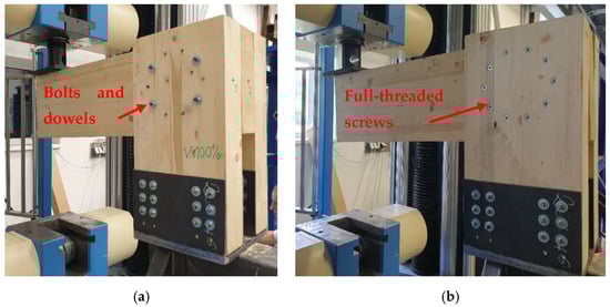 Experimental specimen: (a) experiment A using bolts and dowels; and (b) experiment B using full-threaded screws.