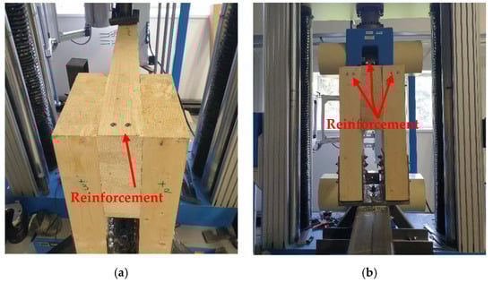Individual experiments were tested at the Center of Building Experiments and Diagnostics, Faculty of Civil Engineering VSB, Technical University of Ostrava, Czech Republic. Figure 11 shows experiment A (a) using a combination of bolts and dowels and experiment B (b) using a full-threaded bolt before static loading. This image shows the unreinforced experimental specimens. The reinforced experimental segments are shown in Figure 12. In Figure 9, an arrow with force F is schematically shown. In fact, the load was applied by means of a steel cylinder with a diameter of 100 mm, and a rubber washer with a thickness of 10 mm was inserted under this steel cylinder to limit the local damage to the wood by the load. The load area of the steel plate corresponds to a typical design. The load area, e.g., corresponds to the load column.