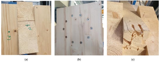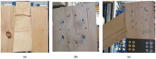 When testing the experiments of structures in the early phase of loading, the individual connecting means were activated (seated). This initial consolidation was detected on the load–deformation diagram by its concave curvature and gradual increase in stiffness, i.e., strengthening. Gradual loading caused the timber mass to be embedded around the connecting means due to them pushing into the timber. This phenomenon can be seen in Figure 13 and Figure 14.