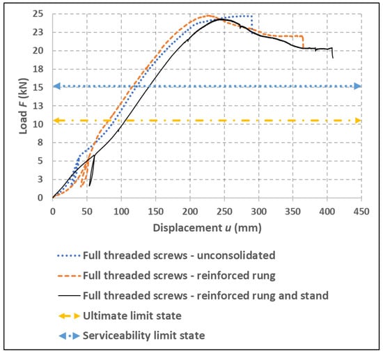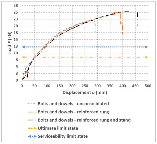 Figure 15 shows the load–deformation curves of experiment A, using bolts and dowels, with a variation of the reinforced and nonreinforced segments of the semirigid connection. Figure 16 shows the load–deformation load curves of experiment B, using full-threaded bolts, with a variation of reinforced and nonreinforced segments. These figures also show the individual limit state levels, where ULS represents the calculated value for the ultimate limit state, and SLS represents the calculated value for the serviceability limit state according to Eurocode 5 [].