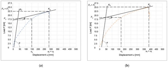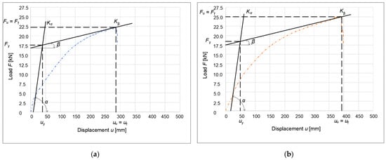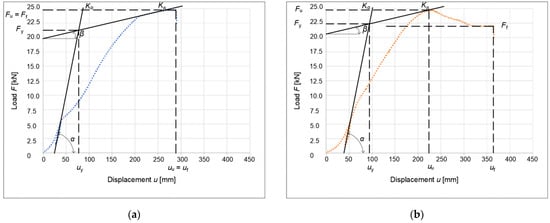 Another method used to obtain ductility is that described by Yasamura and Kawai (1998) []. This method is very similar to the method described in EN 12512 []. The difference, however, is in obtaining the yield point; in this method, the deformation at the yield point is subtracted by intersecting a horizontal line with the working diagram of the connection. In the standard method, this value is read by crossing a vertical line with a working diagram. Figure 19 and Figure 20 show a graphical method for obtaining ductility according to Yasamura and Kawai (1998) [].