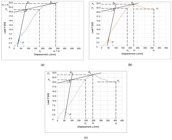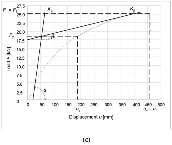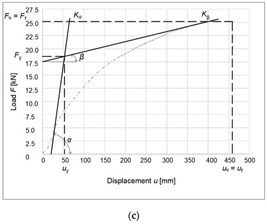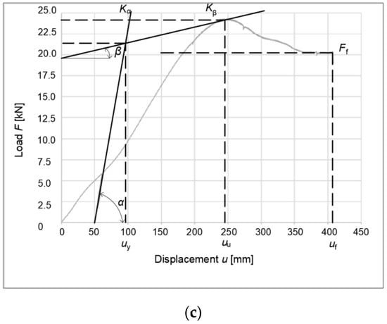 Graphical representation of the yield strength of a connection formed from bolts and dowels according to EN 12512: (a) unreinforced specimen; (b) reinforced partitions; (c) reinforced rung and struts (stands). Kα, stiffness of the connection at the yield point; Kβ, stiffness of the connection at the ultimate point; α, slope of the curve at the yield point; β, slope of the curve at the ultimate point; uy, deformation at the yield point; uu, deformation at the ultimate point; uf, deformation at the failure point; Fy, force at the yield point; Fu, force at the ultimate point; and Ff, force at the failure point.