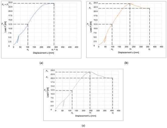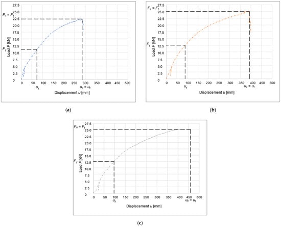 The achieved results of the calculation for individual types of connections, including the final ductility values, are shown in Table 8. In this table, uy denotes the calculated yield stress, uf denotes the failure limit deformation, and Di denotes the calculated ductility value for the connection; the connection is classified in the last column, according to standard EN 12512 [] for individual calculation methods. According to this standard, a classification of 1 indicates a brittle connection, whereas a classification of 4 indicates a connection with high ductility.