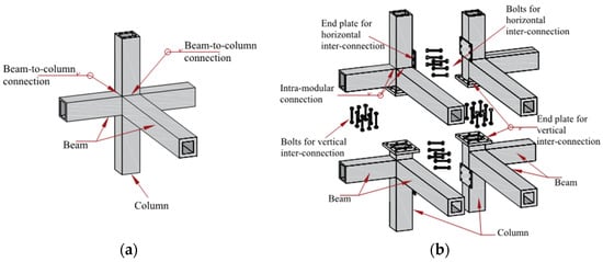 Inter-connections in corner-supported steel modular buildings play a significant role in the integrity and stability of these structures. Moreover, they provide pathways to transfer induced gravity and lateral forces from different elements, such as beams and columns, to the foundation and ground. The introduction of inter-connections to corner-supported modular buildings changes the boundary conditions of columns and the configuration of joints compared to conventional steel structures [4]. That is because, while in conventional structures, each joint comprises a continuous column and two beams connected by beam-to-column connections, each joint in a corner-supported modular building is formed by up to eight discontinuous columns and sixteen beams that are connected by beam-to-column connections or intra-connections, in addition to inter-connections [4]. The lack of continuity in the joints of a modular structure will lead to changes in the stiffness and dynamic properties of the structure, affecting its behaviour and performance against gravity and lateral actions [4,5]. Therefore, having comprehensive knowledge on the influence of inter-connections on the static and dynamic behaviours of modular buildings is indispensable in their design process. Figure 1 compares the details of a joint in a conventional steel building with that in a corner-supported modular steel building.