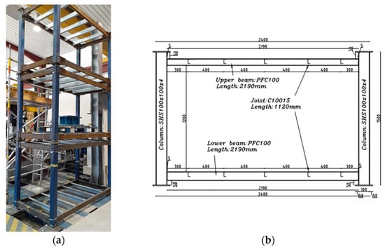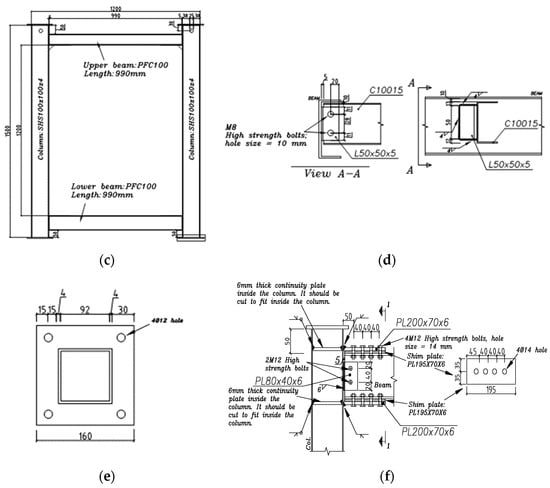 Figure 2a depicts the 3D view of the test specimen. Modules were fabricated in a factory, transported to the structural laboratory of CIE at WSU, and fixed to the strong floor. Each column is connected to the strong floor by four M12 bolts. The lateral-load-resisting system of the structure against wind and earthquake actions is provided by moment-resisting frames. The designed modular building has one bay in both longitudinal and transverse directions. Each module has a length, width, and height of 2.4, 1.2, and 1.5 m, respectively. The test specimen comprises three half-scaled modular units that are connected vertically, so the total height of the building is 4.5 m. The structure was designed based on the Australian standard for the design of steel structures (AS 4100) [48] and the Australian standard for the design of structures against wind actions (AS1170.2) [49]. The details of each modular unit in both longitudinal and transverse directions are shown in Figure 2b,c, respectively.