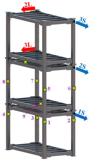 A step-by-step experimental program was conducted to determine the natural dynamic characteristics of the structure. In the first step (test case 1), the acceleration response of the structure was recorded under pure vibration without imposing any external excitation. On the other hand, in steps 2 through 10 (test cases 2 to 10), the acceleration responses of the structure were recorded under randomly generated vibration by hammer impacts at different locations, depicted in Figure 5. These locations are the tops of columns at the first storey, the middle of columns at the second storey, and the middle of the joist at the ceiling level of the first storey. Accelerometers are named based on their orientation, as shown in Figure 5. Accelerometers oriented along the transverse direction of the structure are named 2L and 3L, and accelerometers oriented along the longitudinal direction of the structure are named 1S to 3S. Because of the low amplitude of excitation that may occur in the structure, highly sensitive accelerometers with a sensitivity of 2 V/g were used to record the acceleration response of the system. The technical properties of accelerometers used in this experimental test are tabulated in Table 1.