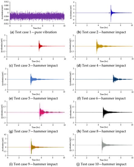 Figure 6 shows the time histories of the acceleration response of the test specimen recorded by accelerometer 3L for different test cases. The figure illustrates that different levels of acceleration, occurring at different times, were generated in the test specimen due to hammer impacts. Generating different intensities of acceleration is required to make sure that all modes of the structure are excited.