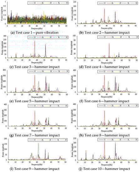 The fast Fourier transform (FFT) of recorded accelerations for different test cases is presented in Figure 7. The figures indicate an increase in the signal−to−noise ratio in test cases 2 to 10 compared to that of test case 1, in which the structure was tested under pure vibration. With reference to Figure 7a, no clear peaks can be observed in the FFT of the response acceleration of the test specimen. Therefore, the natural frequencies of the structure cannot be identified from the pure vibration test, in which no external force is imposed on the structure. However, the FFT of responses obtained from sensors 3L and 2L have a higher amplitude in the range of 4–6 Hz compared to those obtained from other sensors. Moreover, the figure shows that the FFT amplitude of the acceleration response recorded by sensor 2S has a higher value compared to those of other sensors near a frequency of 50 Hz. This indicates that one of the structure’s natural frequencies lies in the range of 4–6 Hz, and the other one is around 50 Hz. The former corresponds to the transverse direction, and the latter corresponds to the longitudinal direction.
