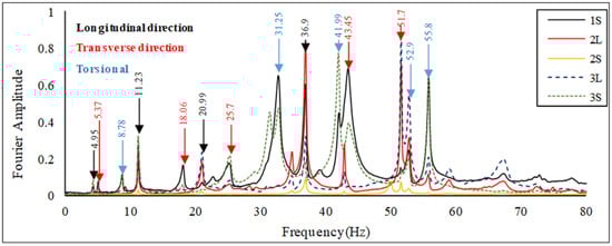 Figure 7b–j shows the FFT of the recorded acceleration of the structure in the hammer impact test. It is seen that the amplitude, direction, and location of hammer impacts influence the excited modes of the test specimen. Imposing a randomly generated vibration on the structure significantly excites the modes of the test specimen. According to Figure 7b–j, the first peak is observed around 4.9 Hz for all test cases, except test case 4, which was recorded by sensor 3S. Therefore, this mode is probably related to the longitudinal direction. The second mode recorded by sensors 2L and 3L occurs around 5.3 Hz, which is related to the transverse direction. The FFT of the response acceleration shows a peak at 8.7 Hz, which is observed at both 3L and 3S sensors. This indicates that the mode is probably related to the torsional direction. Moving to higher modes, two peaks are observed in the range of 10–20 Hz. The first peak in this range is observed at 11.23 Hz, corresponding to the longitudinal direction. This mode is observed in all test cases. On the other hand, the second peak in the range of 10–20 Hz occurs at 18.06 Hz, related to the transverse direction. The fifth peak in the FFT of responses can be observed around a frequency of 21 Hz, corresponding to the longitudinal direction. This mode was recorded by sensors 2L and 3L in different test cases except for test cases 3 and 8. The next natural frequency of the structure is observed at 25.39 Hz, which is related to the transverse direction. In the range of 30–40 Hz, two distinct modes can be observed in all test cases. The first mode in this range occurs at a frequency of 31.2 Hz, and the second mode of the structure is observed at a frequency of 36.9 Hz. The former corresponds to the longitudinal direction, and the latter relates to the torsional direction. Some other peaks are observed at 40–70 Hz. However, for frequencies higher than 70 Hz, no distinct modes can be observed.