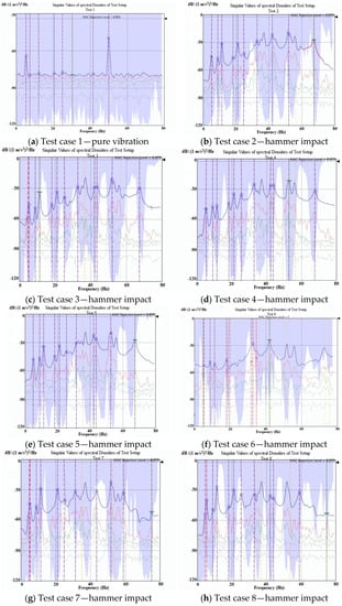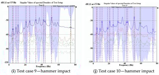 The EFDD method uses the SVD of the power spectral density of the acceleration response of the structure to analyse data in the frequency domain. The EFDD method was employed to validate the modes extracted by the FFT method in the previous section. The SVD of the acceleration response of the structure corresponding to different test cases, along with some identified frequencies, is shown in Figure 9.