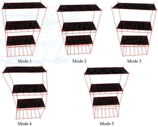 The SSI technique, which is based on the time domain, was used to identify the natural characteristics of the test specimen through the signal processing of the same recorded acceleration response. Figure 11a,b illustrate the stabilisation diagrams of state-space models of test cases 6 and 10, respectively. The eigenvectors and eigenvalues of the dynamic matrix of the model, which are indicative of the natural frequencies and mode shapes of the structure, can be determined from the stabilisation diagrams. The determined natural frequencies and mode shapes are independent of the order of the numerical model and process. The natural frequencies and damping ratios of the test specimen extracted using the SSI technique are listed in Table 4 and Table 5, respectively.