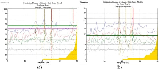Stabilisation diagram of estimated state-space models of (a) test case 6—hammer impact; (b) test case 10—hammer impact.
