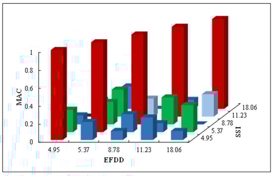 where φEFDD,A and φSSI,B are mode shapes A and B of the structure extracted by the EFDD and SSI algorithms, respectively. The MAC can be in the range of 0 to 1, where a value of unity indicates a perfect correlation between the two identified modes, and a value of zero illustrates that the two identified modes are orthogonal and have no similarity. Figure 12 shows the MAC values of the first five identified modes of the structure. The results indicate that the correlation between the extracted modes lies between 0.95 to 1, illustrating a perfect correlation between the identified modes in frequency and time domains. The results show that both methods can be efficiently employed as an output-only algorithm.