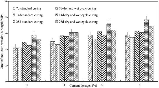 The strength of CSPB specimens under different curing environments and cement dosages is illustrated in Figure 2. It is clear that under different curing ages, the strength of CSPB specimens in standard maintenance is better than that in a dry–wet cycle curing environment. Under the same curing environment, strength increases with the extension of the curing age and with the increase in cement dosages. At the same time, the strength of all CSPB specimens is greater than the design value of 4.0 MPa under different curing environments, cement contents, and curing ages, which meets the design requirements in JTG/T F20.
