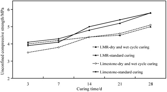 To analyze the difference in strength performance of CSPB material prepared from LMR as aggregate and other commonly used rock aggregates, limestone was used as a control group for testing, and the 4% cement dosage was selected in the experiment. Figure 3 illustrates that the strength of CSPB specimens with LMR is similar to that of limestone CSPB specimens in standard maintenance and dry–wet cycle curing environments. This shows that LMR can replace general stone as aggregate to prepare CSPB material, and it meets the strength requirements. Therefore, it is feasible to use LMR as aggregate to prepare CSPB.