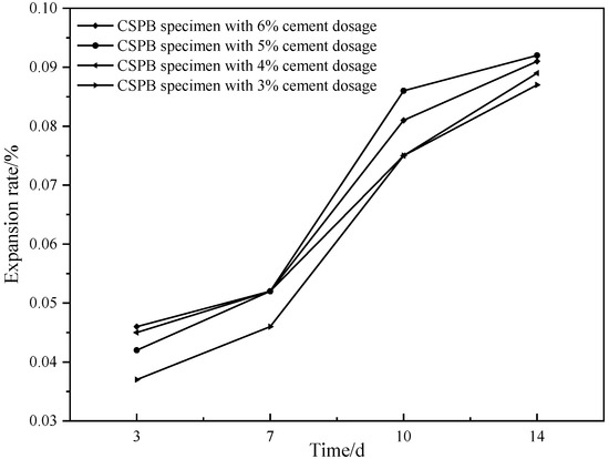 Expansion rates of LMR-CSPB from the mortar bar method are shown in Figure 4. It is clear that the expansion of LMR-CSPB specimens increases with the curing time regardless of the cement dosage. However, the 14-d expansion rate of all specimens is less than 0.1%, which indicates that no AAR occurred in the LMR-CSPB specimens. The main reason is that the amount of cement used is very small, and its total alkali content is low. A sufficient alkaline solution environment for AAR is not provided in LMR-CSPB. Therefore, it will not cause the occurrence of AAR when the LMR is used in the CSPB within the cement dosage of 6%.