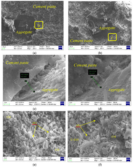 The morphologies of LMR-CSPB are shown in Figure 5. Figure 5a,b present the bonding state of the ITZ in the LRM-CSPB and L-CSPB specimens. It is obvious that the bonding between the aggregate and the cement paste is relatively close, and the structure is compact for both LMR-CSPB and L-CSPB. In L-CSPB specimens, an obvious crack is found at the edge of the aggregate. However, there is no crack in the interface of LRM-CSPB specimens. Magnified observation and analysis of the transition zone between the aggregate and the cement paste were carried out to clarify whether the crack is caused by AAR (see Figure 5c,d). The distribution of hydration products in the ITZ of LRM-CSPB and L-CSPB specimens is illustrated in Figure 5e,f. From Figure 5d,f, it can be seen that there is calcium hydroxide and ettringite hydrate in the crack, and there is no honeycomb alkali-silicate gel. At the same time, there are obvious rod-shaped ettringite crystals (AFt), hexagonal calcium hydroxide, and amorphous or agglomerated C-S-H gel products in the L-CSPB specimens. In addition, no AAR product can be observed.