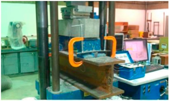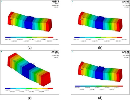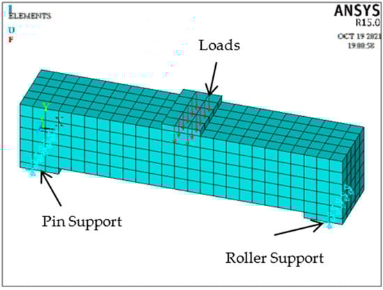 - Designating the applied loads from the previous studies [37,38] in the top–middle regions of the models to obtain true behaviours for the simulated models, where the right support of the models was simulated as the roller support by restraining the movement in the vertical loading direction, while the left support was restrained in two directions against the movements in the vertical direction and in the direction parallel to the axis of the models as a pinned support. Hence, the applied loads were simulated gradually to be identical to the experimental loads.