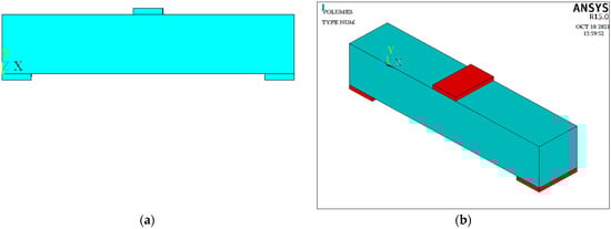 - In the analysis of the nonlinear behaviours of the models, the open and closed shear coefficients were defined as 0.2 and 0.7, with the splitting tensile modulus within the ANSYS program, [25] as stated in the references [42,43,44], with the details of the simulated beam models shown in Figure 6 and Figure 7. Hence, these parameters were defined for the simulated models as constants for the purpose of analysis.