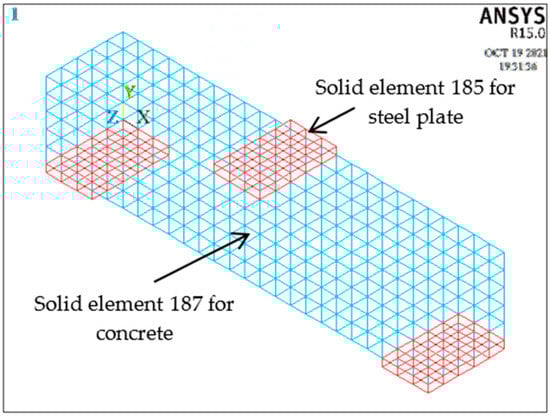 - After deciding the geometries of the models, carrying out the meshing for the rectangular concrete beam and the supporting steel plates by specifying the properties and selecting the elements for individual materials, e.g., concrete and steel plates, and then dividing the models to small 10 mm element sizes in a homogeneous or heterogeneous manner, i.e., the concrete was represented by the solid element 187, and the steel plates were modelled by using the solid element 185, see Figure 5, Figure 6 and Figure 7.