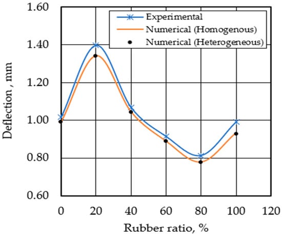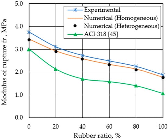 - The flexural resistance of the numerical rubberised concrete beam models was largely degraded with the increasing content of added rubbers that replaced the coarse aggregates. The flexural strength or the modulus of rupture decreased with the increasing rubber replacement ratio by 15–49%. The numerical and experimental results of the modulus of rupture agreed very well and the differences ranged from 5% to 9% for the homogeneous and heterogeneous rubber concrete beam models and experimental studies.
