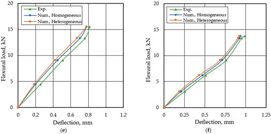 | Mix No. | Experimental [37,38] | Numerical Homogeneous | Num./Exp. | Numerical Heterogeneous | Num./Exp. | |||||
