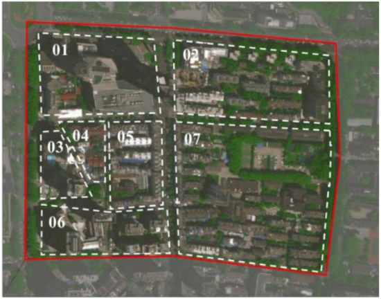 Model validation is the key to determine the accuracy and reliability of the numerical simulation. In urban simulations, the sensing size of the measuring instruments is too small relative to the study area. It is necessary to arrange numerous measuring points to obtain data representing the entire area, which is difficult to achieve in practice. Therefore, it is more practical to validate porous media models at the microscale. The representative high-density block buildings in the central area of Xinjiekou, Nanjing, in hot summer and cold winter areas, were selected as the research object. Streets surround the selected block, and the buildings in the block are almost always north–south orientation. According to Ma Jian’s [31] simulation results of streets with different aspect ratios, when B/H = 0~1 and B/W = 0~1, the whole building group can be integrated into an integral building, as shown in Figure 2. Based on the site investigation, the simulated areas are divided into 7 building blocks with different porosities, as shown in Figure 1.
