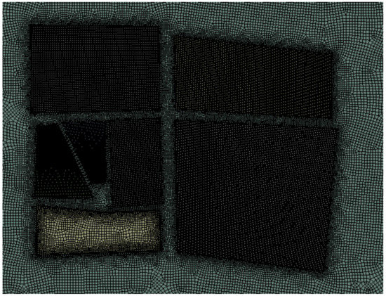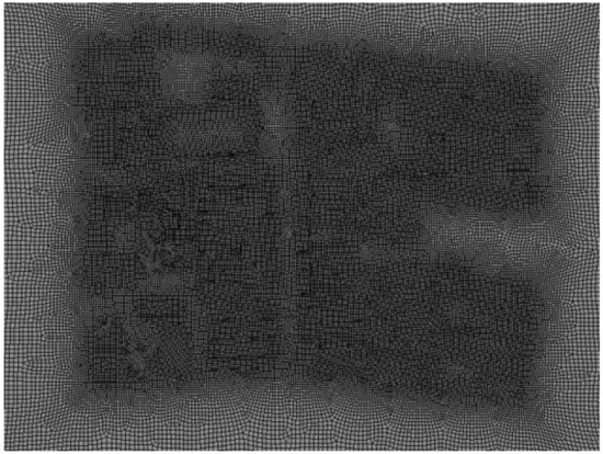 When the standard CFD method divides the model grid, the building group was the key research object, and the grid independence test was carried out. After setting the same boundary conditions for the four grids with grid numbers of 1,789,673, 2,185,209, 3,268,935, and 4,195,998, the simulations were performed separately, and the average wind speed at the outlet of the block was recorded. The simulation results were 0.341, 0.384, 0.430, and 0.449 m/s, respectively, indicating that when the number of grids exceeds 3 million, the simulation results tend to be stable (the difference is about 4.4%). Therefore, subsequent calculations of standard CFD method would use grids with a grid number of about 3 million for calculation. The porous media model uses the same method to evaluate the meshes with the number of meshes of 797,651, 1,847,621, 2,767,710, and 3,952,174 and four meshes, namely 2,767,710. The meshes of the two models are shown in Figure 5 and Figure 6.