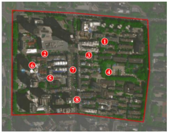 Model validation is the key to determining the accuracy and reliability of numerical simulations. In this study, the standard CFD modeling method and the porous media method were used to simulate the micro-thermal environment of the block, and the measurement points were measured in the block to verify the accuracy of the simulation results. In this paper, the “virtual synchronous measurement method” was selected for measurement on a typical summer day in July. The measurement points were mainly selected along the main road, the corner of the building, and the open space around the building, and the measurement height was about 1.5 m. The measuring device was used for each measurement point test time of 10 min, every interval of 30 s to record the data, the average value was taken as the result, and the instrument parameters tested are shown in Table 2. The selection of measuring points is shown in Figure 7, and the field measurement is shown in Figure 8.
