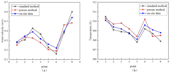 Since the monitoring points in the simulation may be different from the field measurement points, the average values of 5~6 points near the simulation’s monitoring points were used to compare the simulated values and the measured values. Figure 9 shows the comparison results of wind velocity and temperature between measured and simulated values at different points.