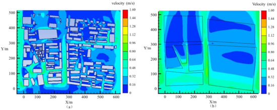 Diagram of wind velocity distribution modeled by the (a) standard CFD method and (b) porous media method.