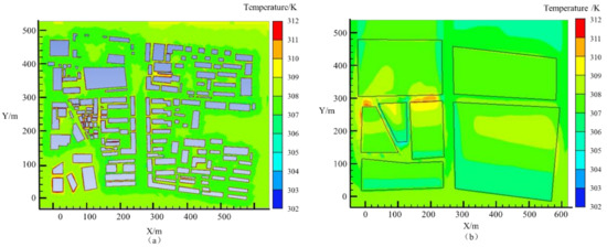 The simulation results of the standard model and the porous media model are compared to analyze further the feasibility of using the porous media modeling method instead of the standard CFD modeling method in studying the microthermal environment of the block. Figure 10 shows the wind velocity at the pedestrian height of the block using two methods, respectively, and Figure 11 shows the cloud diagram of temperature distribution. The velocity and temperature distribution in the block are similar to different simulation methods, and the porous media model method can characterize the micro-thermal environment of each block zone well. In the main road between buildings, especially in the south–north direction of the main street, the wind speed shows a trend of attenuation along the direction of the street, which promotes ventilation to improve the micro-thermal environment of the block. The velocity of the main street calculated by both methods is between 0.5 and 0.62 m/s, and the temperature is between 307 and 309 K.