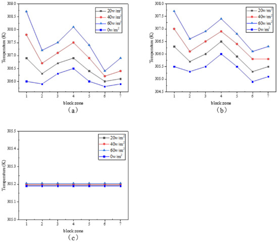 The results show that the mean temperature of each area at different heights increases significantly with the increase in the anthropogenic heat intensity in the block. Furthermore, since the anthropogenic heat will diffuse downstream with the wind direction, the upstream heat source intensity will impact the downstream streets and areas, which is the main reason for the significantly higher temperature in Block 1. The distribution of wind speed and temperature in each area is also in line with the law that the block with high porosity has high wind speed and low temperature. When the airflow enters the block, the wind velocity in the area with large porosity is relatively large, and the high-speed wind increases the heat. The exchange flux makes the anthropogenic heat dissipate rapidly, so the anthropogenic heat has relatively little effect on the areas with high porosity. At the heights of 2 and 10 m, the temperature distribution in each region is basically the same. At the height of 2 m, the variation gradient of anthropogenic heat is about 0.025 K/W. However, at the height of 10 m, due to the increase in wind speed and the effect of lateral wind, the heat diffuses relatively faster, and the influence of anthropogenic heat on the thermal environment at this height is weakened. Since the average building height is lower than 50 m, the anthropogenic heat intensity at the height of 50 m has little effect on the thermal environment.
