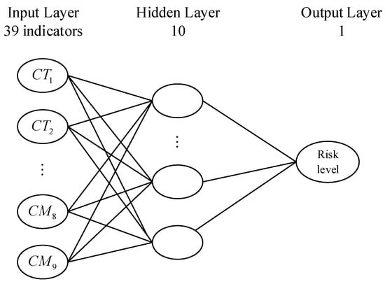 In 1943, the first neuronal M-P model was proposed by McCulloch-Pitts, and the research on neural networks began [,]. Since then, more derivative models of neural networks have emerged. After Rosenblatt’s first perceptron model in 1957, many influential models have been proposed [,]. Neural networks rapidly developed and were used within different fields []. Neural networks have various functions, such as learning, training, simulation, storage, and error removal, which allow them to develop rapidly in many fields and achieve great success in signal processing, pattern recognition, etc. In recent years, more and more scholars have applied them in the research of artificial intelligence [,,,,,,]. Scholars have applied BP neural networks to construction risk assessment and achieved a large number of results, which fully demonstrate the feasibility of BP neural networks for construction risk assessment [,,,]. A BP neural network is a nonlinear dynamical system that constructs a model to realize nonlinear analysis by learning and understanding historical data. Compared with the conventional linear analysis methods, a BP neural network has the following advantages [,]: (i) it can process data with ambiguous feature performance and logical relationships; (ii) it can process nonlinear characteristic random noisy data; and (iii) it does not require an in-depth understanding of the simulation process. In the case of having more uncertainty, the neural network model can fully demonstrate its superiority in processing data. Based on the above advantages, a BP neural network was selected as the model for risk evaluation in this study.