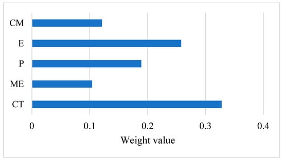 The weight values of CT, ME, P, E, and CM were 0.328, 0.104, 0.189, 0.258, and 0.121 respectively, as shown in Figure 3. From Figure 3, it can be seen that the risks of construction technology and environment have a relatively strong influence on the construction safety of high cutting slopes in HSR, and the risk of material and equipment, personnel, and construction management have a relatively weak influence on it.