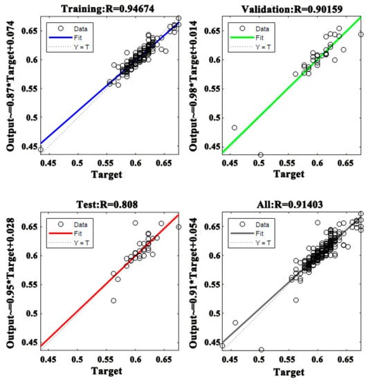 According to the BP neural network algorithm, Matlab was used to create the neural network and run the results. After 11 iterations, the training MSE value of the simulation training was 0.000176, which is less than the target value of 0.0003. This met the predetermined accuracy requirements, and the BP neural network model achieved convergence. The simulation results are shown in Figure 4; it can be seen that the R-values of the training set and test set are 0.947 and 0.808, which indicate that the model fits the observed values well.