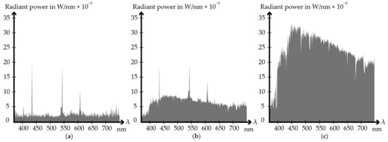 - Judd, D.B.; MacAdam, D.L.; Wyszecki, G.; Budde, H.W.; Condit, H.R.; Henderson, S.T.; Simonds, J.L. Spectral Distribution of Typical Daylight as a Function of Correlated Color Temperature. J. Opt. Soc. Am. 1964, 54, 1031. [Google Scholar] [CrossRef]