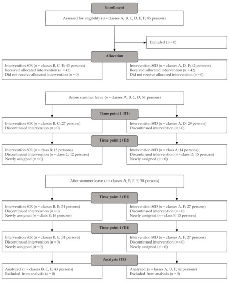 | Semester 2–3 | Time | 1.68 (1.96, ∞) | 0.188 | n.s. | T3 | 0.48 | 80D × T3 | 0.49 | 80R × T3 | 0.48 |