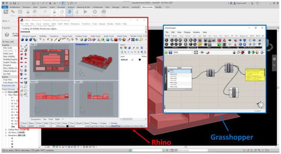 The energy performance process is based on the created central Revit model, using Rhino as its host platform and running the Ladybug plug-in for visual programming through the built-in Grasshopper in Rhino. Energy performance analysis is conducted mainly for the specific region’s climate, skylight, and radiation. The performance scheme can be optimized to meet energy performance requirements to enable architectural design. The parametric design requires the Rhino inside Revit plug-in to realize the model information’s bidirectional input and output, breaking the past need to switch between different platforms [58]. Figure 2 presents that Rhino was upgraded to version 7.10 to run properly.